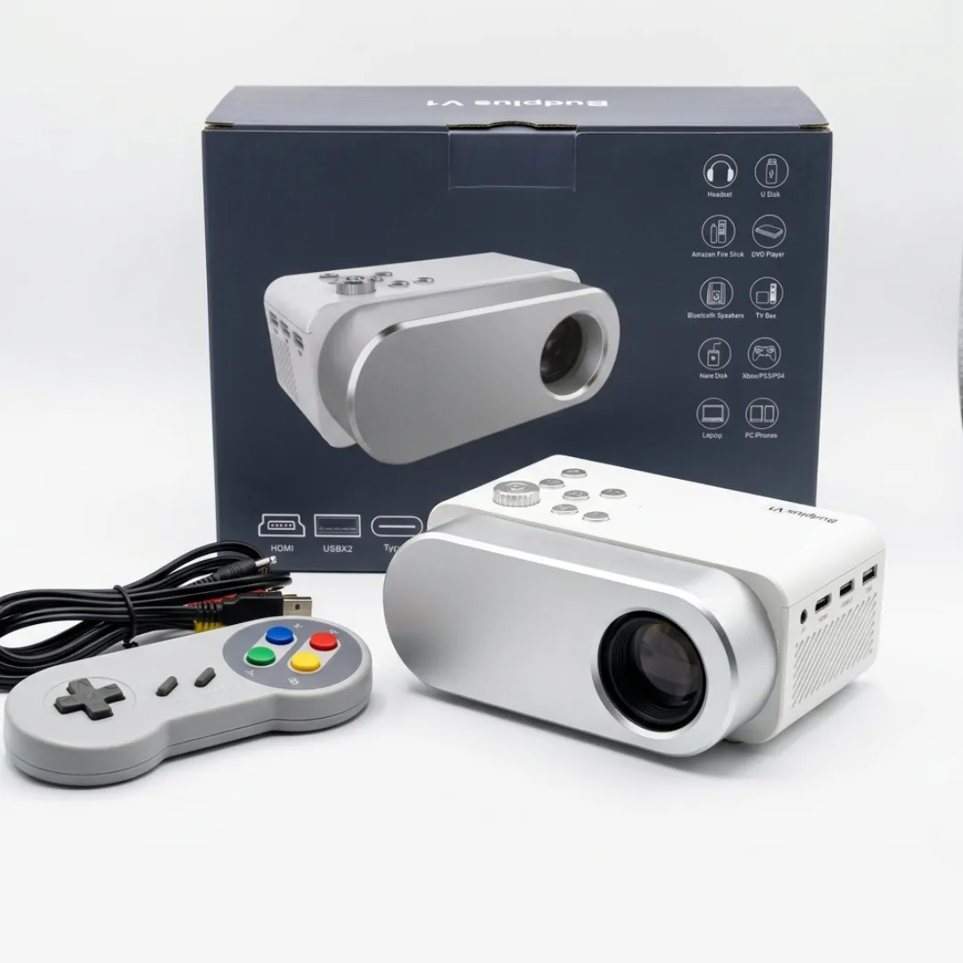 • Specification TechnicalFeatureDetailsModelBudplus V1Display Technology2.4" LCDSupport Resolution1920 x 1080 (fHD)ControlManual / remote controlProjection Distance0.8-5mLife Span>50000hoursLight sourceLED RGBLuminanceBuilt-in speakerAspect Ratio16:9 & 4:3EntertainmentSupport download gamesProjection Size30 - 120" inchesProjector power28WLanguage supportEnglish, French, Spanish, Polish etc 23 languagesPackage Contents1 x LCD Projector (US/EU/UK/AU/CN etc Plug), 1 x game pad (optional), 1 x power adaptor, 1 x Remote Control, 1 x AV Cable, 1 x English Instruction Manual